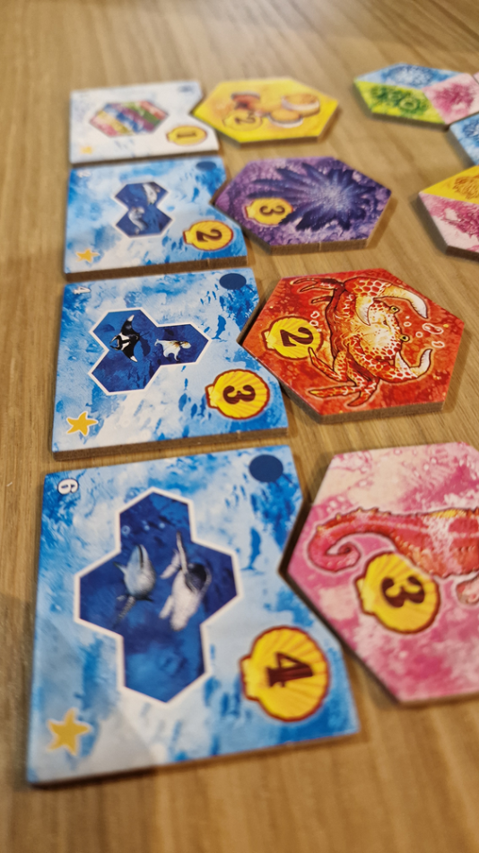 AQUA joga em 17 rodadas. Na sua vez, você deve pegar uma nova peça de coral do mercado e adicioná-la ao seu recife, então você também pode atrair animais para seu ecossistema se criar os padrões corretos de coral.