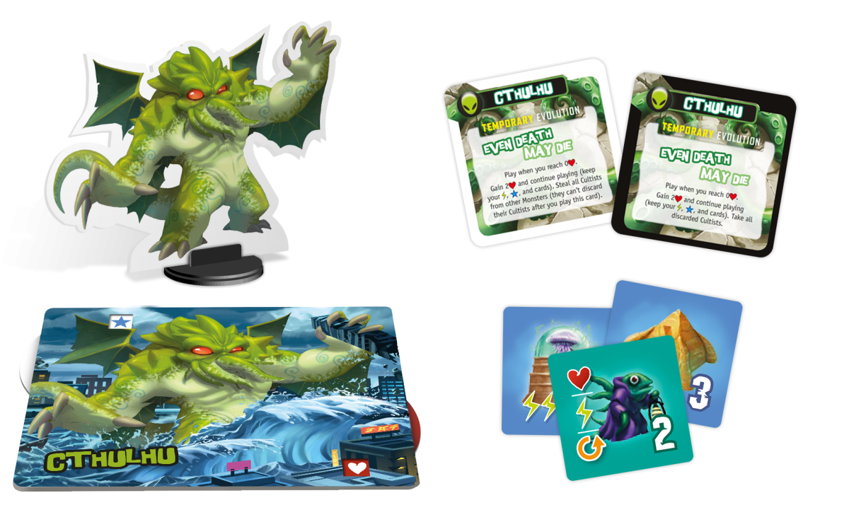 O Monster Pack: Cthulhu inclui um novo monstro, Cthulhu, caso você não tenha adivinhado, além de oito cartas de evolução para usar no King of Tokyo. Você também pode jogar com as peças cultistas, que dão aos jogadores um efeito bônus ao obtê-las Além de oito cartas de evolução e quinze fichas de cultista (que também são Templo de Cthulhu) .